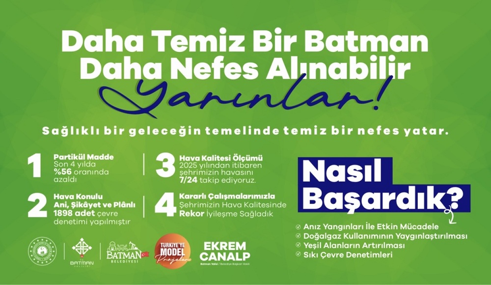 Batman’da çevre yatırımları ve sıkı denetimler sayesinde hava kalitesinde dikkat çekici bir iyileşme sağlandı. Vali ve Belediye Başkan Vekilimiz Ekrem Canalp öncülüğünde yürütülen çalışmalar sonucunda, son 4 yılda hava kirliliğinde %56’ya varan düşüş kaydedildi.